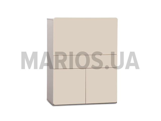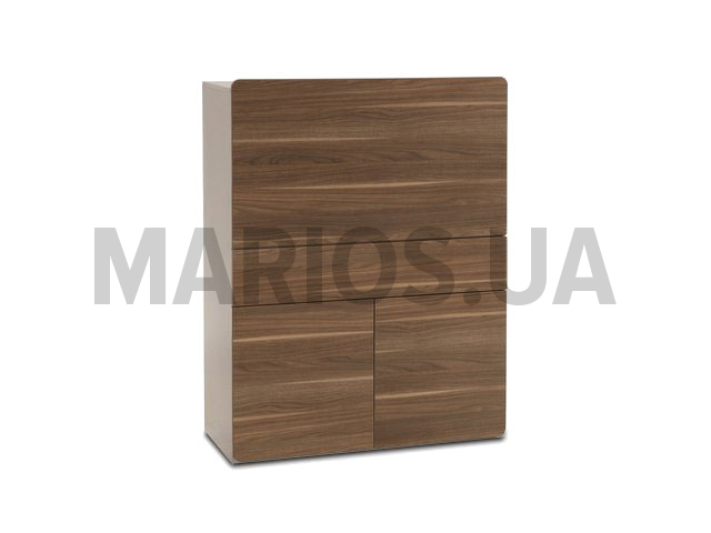 Состоит из шкафчика-бара, выдвижного ящика и двух шкафчиков с полками. Все ящики и шкафы не имеют ручек для открытия, оснащены системой push-up.