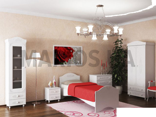 Характеристики мебели Материал ДСП, МДФ, ПВХ Белая мебельная система Ассоль-3 очень актуальна для детской комнаты или комнаты подростка. Дополнив этот гарнитур еще одной односпальной кроватью, Вы получите прекрасный белый комплект мебели для спальни на двоих. Кровать односпальная АС-09 Ассоль выделяется благодаря своей прочности и комфортабельности для спящего. Ее украшением служат красивые изголовье и изножье с нежным объемным рисунком. Кровать с металлическим каркасом и буковыми ламелями стоит дополнить односпальным ортопедическим матрасом размером 80х200. Тумба прикроватная АС-04 Ассоль спрячет все необходимые Вам мелочи, чтобы они всегда были под рукой. Шкаф двухдверный АС-02 Ассоль и комод АС-05 Ассоль предложат вдвое больше вместительности для порядка в комнате и размещения всех вещей. В спальный гарнитур Ассоль-3 входят такие предметы мебели модульной системы: Кровать односпальная АС-09 Ассоль;Витрина АС-01 Ассоль;Шкаф двухдверный АС-02 Ассоль;Тумба прикроватная АС-04 Ассоль;Комод АС-05 Ассоль. Размеры кровати односпальной АС-09 Ассоль: ширина: 90 см;высота: 85,4 см;длина: 204,2 см. Размеры витрины АС-01 Ассоль: ширина: 53, 2 см;высота: 210 см;глубина: 41, 6 см. Размеры шкафа двухдверного АС-02 Ассоль: ширина: 83, 2 см;высота: 210 см;глубина: 51, 6 см. Размеры тумбы прикроватной АС-04 Ассоль: ширина: 45 см;высота: 45 см;глубина: 35 см. Размеры комода АС-05 Ассоль: ширина: 80 см;высота: 80 см;глубина: 50 см. Материалы: модули изготовлены из ДСП 16 мм;применяются МДФ фасады;торцы деталей обклеиваются ПВХ-кромкой. Особенностью является применение технологии нанесения 3D-узора. Ручки – фигурные. Вы также можете приобрести каждый элемент системы Ассоль по отдельности.
