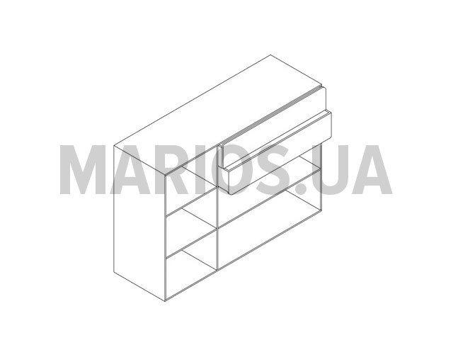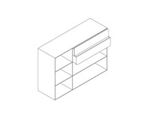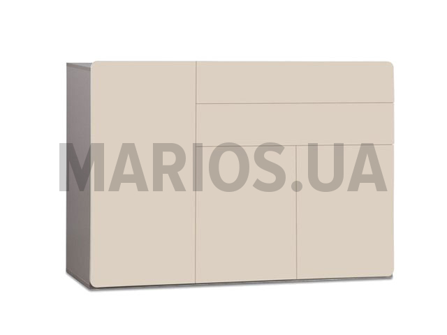 Буфет состоит из высокого шкафчика с полками. Полки регулируются по высоте, согласно предметам, которые будут стоять на них. Имеется также два выдвижных ящика и за двумя дверцами имеется две регулируемые по высоте полки. Все ящики и шкафы не имеют ручек для открытия, оснащены системой push-up.
