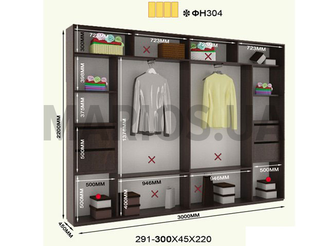 45.00см x 300.00см x 220.00см Характеристики шкафа Количество дверей4 двери Материал корпусаДСП 18мм, кромка ПВХ 0,5 и 2мм Оснащение12 полок, 4 двери (ДСП или зеркало), 2 отделения для тремпелей Форма шкафалинейный Четырехдверный шкаф Фаворит ФН304 220В комплектацию модели входит: 12 полок, два отделения для тремпелей и четыре двери с профилем Элит в цвете серебро. Двери шкафа могут быть выполнены из ДСП, зеркальные, комбинированные или же с вертикальными делениями. Дополнительно можно заказать бельевой отдел, радиус Ф 45, радиус Ф 60, радиус Ф 35, радиус Ф 50, полку, трубу, стойку. За дополнительную плату. Размеры шкафа: глубина/ширина/высота - 45/291-300/220. Цена указана за шкаф стандартного размера шириной 300 см и высотой 220см. Шкаф с нестандартной шириной от 291 до 289 оплачивается дополнительно. Также возможно изготовление шкафа высотой 250 смМатериалы, из которых изготовлен шкаф: Корпус: ДСП 18мм; Фасады: зеркальные или ДСП; Кромка: ПВХ 0.5 и 2мм; Зеркало: 4 мм; Штанга: микролифт металлический. Профиль: Элит или Квадратный. Цвет: серебро, золото светлое, бронза светлая, венге глянец. Раздвижная система: алюминиевая.