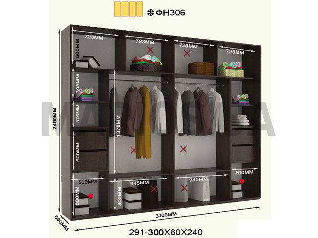 60.00см x 300.00см x 240.00см Характеристики шкафа Количество дверей 4 двери Материал корпуса ДСП 18мм, кромка ПВХ 0,5 и 2мм Оснащение 12 полок, 4 двери (ДСП или зеркало), 2 отделения для тремпелей Форма шкафа линейный Четырехдверный шкаф Фаворит ФН306 240 В комплектацию модели входит: 12 полок, два отделения для тремпелей и четыре двери с профилем Элит в цвете серебро. Двери шкафа могут быть выполнены из ДСП, зеркальные, комбинированные или же с вертикальными делениями. Дополнительно можно заказать бельевой отдел, радиус Ф 45, радиус Ф 60, радиус Ф 35, радиус Ф 50, полку, трубу, стойку. За дополнительную плату. Размеры шкафа: глубина/ширина/высота - 60/291-300/240. Цена указана за шкаф стандартного размера шириной 300 см и высотой 240см. Шкаф с нестандартной шириной от 291 до 299 оплачивается дополнительно. Также возможно изготовление шкафа высотой 250 см Материалы, из которых изготовлен шкаф: Корпус: ДСП 18мм;Фасады: зеркальные или ДСП;Кромка: ПВХ 0.5 и 2мм;Зеркало: 4 мм;Штанга: микролифт металлический.Профиль: Элит или Квадратный. Цвет: серебро, золото светлое, бронза светлая, венге глянец.Раздвижная система: алюминиевая.