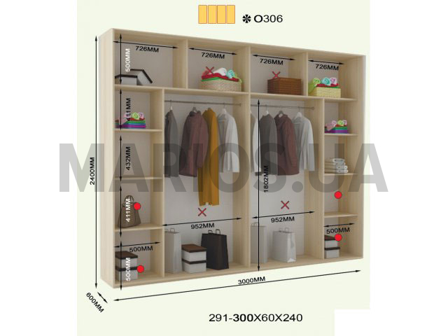 60.00см x 300.00см x 240.00см Характеристики шкафа Количество дверей4 двери Материал корпусаДСП 16мм, кромка ПВХ 0,5 и 2мм Оснащение12 полок, две штанги для тремплей, четыре двери (ДСП, зеркало) Форма шкафалинейный Четырехдверный шкаф-купе ОН-306 240.В комплектацию шкафа входит: 12 полок, два отделения для тремпелей и четыре двери с профилем Элит в цвете серебро. Дополнительно можно заказать блок В35 и В50. Двери шкафа могут быть выполнены из ДСП, зеркальные, комбинированные или же с горизонтальными делениями. Размеры шкафа: глубина/ширина/высота - 60/291-300/240. Возможно выполнение шкафов высотой 250см за дополнительную плату. Материалы, из которых изготовлен шкаф-купе ОН-306 240: Корпус: ДСП 16мм; Фасады: зеркальные и панельные; Кромка: ПВХ 0.5 и 2мм; Зеркало: 4 мм; Штанга: микролифт металлический. Профиль: Элит или Квадратный. Цвет: серебро, золото светлое, бронза светлая, венге глянец. Раздвижная система: алюминиевая.