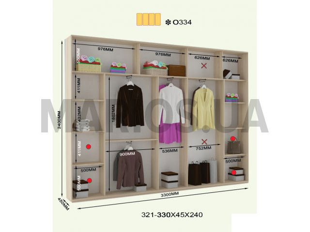 45.00см x 330.00см x 240.00см Характеристики шкафа Количество дверей4 двери Материал корпусаДСП 16мм, кромка ПВХ 0,5 и 2мм Оснащение12 полок, четыре штанги для тремплей, четыре двери (ДСП, зеркало) Форма шкафалинейный Четырехдверный шкаф-купе ОН-334 240.В комплектацию шкафа входит: 12 полок, четыре отделения для тремпелей и четыре двери с профилем Элит в цвете серебро. Дополнительно можно заказать блок В35 и В50. Двери шкафа могут быть выполнены из ДСП, зеркальные, комбинированные или же с горизонтальными делениями. Размеры шкафа: глубина/ширина/высота - 45/321-330/240. Возможно выполнение шкафов высотой 250см за дополнительную плату. Материалы, из которых изготовлен шкаф-купе ОН-334 240: Корпус: ДСП 16мм; Фасады: зеркальные и панельные; Кромка: ПВХ 0.5 и 2мм; Зеркало: 4 мм; Штанга: микролифт металлический. Профиль: Элит или Квадратный. Цвет: серебро, золото светлое, бронза светлая, венге глянец. Раздвижная система: алюминиевая.