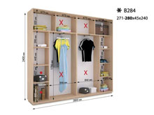 45.00см x 280.00см x 240.00см Характеристики шкафа Количество дверей 4 двери Материал корпуса ДСП 18мм, кромка ПВХ 0,5 и 2мм Оснащение 12 полок, четыре двери (ДСП или зеркало), 2 отделения для тремпелей, 2 микролифта Форма шкафа линейный Четырехдверный шкаф-купе В284 - это отличный стильный шкаф, который украсит интерьер в любой комнате и вместит в себя массу полезных вещей. В комплектацию модели входит: 12 полок, 2 отделения для тремпелей с двумя микролифтами и четыре двери с профилем Элит в цвете серебро. Дополнительно можно заказать блок В35 или В50. Двери шкафа могут быть выполнены из ДСП, зеркальные, комбинированные или же с горизонтальными делениями. Размеры шкафа: глубина/ширина/высота - 45/271-280/240. Возможно выполнение шкафов высотой 250см за дополнительную плату. Материалы, из которых изготовлен шкаф-купе В284: Корпус: ДСП 18мм;Фасады: зеркальные и панельные;Кромка: ПВХ 0.5 и 2мм;Зеркало: 4 мм;Штанга: микролифт металлический.Профиль: Элит или Квадратный. Цвет: серебро, золото светлое, бронза светлая, венге глянец.Раздвижная система: алюминиевая. Стандартные цвета в складской программе: венге магия;яблоня Локарно;ольха горная;дуб молочный;белый;орех лесной. Срок изготовления шкафов в стандартной цветовой гамме составляет 3-4 дня. Стандартные цвета, не входящие в складскую программу: орех темный. Срок изготовления шкафов в этих цветах составляет 10 дней. Нестандартные цвета: дуб арканзас темный. Шкафы в нестандартных цветах изготавливаются за дополнительную плату в течении 10 дней. Данные цвета не используются для фасадов.