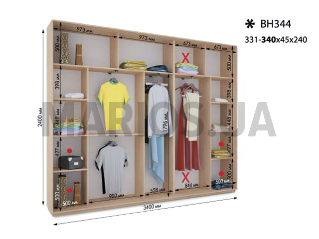 45.00см x 340.00см x 240.00см Характеристики шкафа Количество дверей4 двери Материал корпусаДСП 18мм, кромка ПВХ 0,5 и 2мм Оснащение12 полок, четыре двери (ДСП или зеркало), 4 отделения для тремпелей, 4 микролифта Форма шкафалинейный Четырехдверный шкаф-купе ВН344 - это большой вместительный шкаф отличного качества. В этой модели может храниться масса полезных вещей, при этом она украсит любой масштабный интерьер.В комплектацию модели входит: 12 полок, 4 отделения для тремпелей с четырьмя микролифтами и четыре двери с профилем Элит в цвете серебро. Дополнительно можно заказать блок В35 или В50. Двери шкафа могут быть выполнены из ДСП, зеркальные, комбинированные или же с горизонтальными или вертикальными делениями. Размеры шкафа: глубина/ширина/высота - 45/331-340/240. Цена указана за шкаф стандартного размера шириной 340см. Шкаф с нестандартной шириной от 331см до 3239см оплачивается дополнительно. Также возможно изготовление шкафа высотой 250см. Материалы, из которых изготовлен шкаф-купе ВН344: Корпус: ДСП 18мм; Фасады: зеркальные и панельные; Кромка: ПВХ 0.5 и 2мм; Зеркало: 4 мм; Штанга: микролифт металлический. Профиль: Элит или Квадратный. Цвет: серебро, золото светлое, бронза светлая, венге глянец. Раздвижная система: алюминиевая. Стандартные цвета в складской программе: венге магия; яблоня Локарно; ольха горная; дуб молочный; белый; орех лесной. Срок изготовления шкафов в стандартной цветовой гамме составляет 3-4 дня. Стандартные цвета, не входящие в складскую программу: орех темный. Срок изготовления шкафов в этих цветах составляет 10 дней. Нестандартные цвета: дуб арканзас темный. Шкафы в нестандартных цветах изготавливаются за дополнительную плату в течении 10 дней. Данные цвета не используются для фасадов.