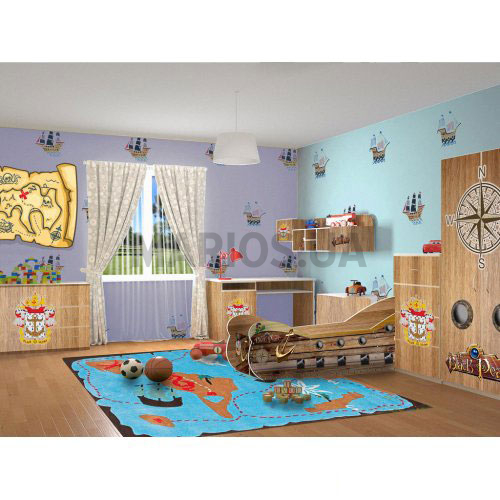 Характеристики мебели Материал ДСП Детская комната Пират Книжная полка - 178х28х45 смКомод 3 - 88х49х89 смКомод 4 - 60х49х116Кровать односпальная с размером спального места 80х160 смПисьменный стол - 130х55х77Тумба прикроватная - 60х49х62 смГардеробный шкаф - 88х47,5 х200 см Кровать может быть изготовлена в двух сериях: серия Форсаж - когда внешнее оформление проводится с помощью отдельных разноцветных наклеек;серия Драйв – оформление изделия сплошной цельной наклейкой, покрытой слоем защитного ламината, предохраняющего рисунок от повреждений. На данную серию применяется надбавка к цене. Возможна комплектация с кроватью другого размера. Материал: ДСП.