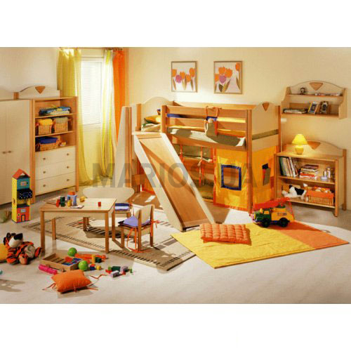 Характеристики мебели Материал Массив бука, шпон бука и явора, МДФ Детская система Эльф-7 поможет создать игровую атмосферу в детской комнате, которая понравится Вашему ребенку в которой намного легче и интереснее будет протекать его развитие. Главной фигурой является кровать ярусная с горкой. Такая модель – это еще более веселый и интересный для ребенка способ проведения досуга. С такой кроватью спальное место будет использоваться не только для сна, но и станет прекрасным игровым местом и способом выплеснуть накопившуюся энергию. Кровать расположена на «втором этаже» конструкции, путь к которой идет через небольшую горку, с которой очень весело будет съезжать. Также, комната имеет игровой уголок в виде стола, стульчика и скамьи. Для размещения книг и ребенка будет навесная полка и комод с открытыми полками. Вещи и игрушки можно разместить в этажерке с выдвижными ящиками и в шкафу. Все модели изготовлены из экологически чистых и гипоаллергенных материалов (массива бука, шпоны бука и явора, МДФ), а также имеют закругленные концы для безопасности Вашего малыша. В цену входит шкаф гардеробный детский, но по Вашему желанию можно заменить на шкаф гардеробный подростковый. В комплект входит: кровать ярусная с горкой 90х200;стол игровой детский;стульчик детский;скамья детская;полка навесная;комод с открытыми полками;этажерка широкая с выдвижными ящиками;шкаф гардеробный детский.