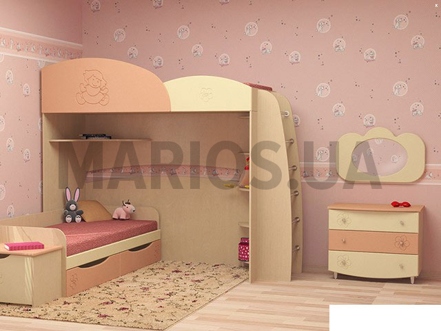 ручки цвета "сатин". Регулируемые опоры позволяют компенсировать неровности пола, винтовые стяжки - гарантировать устойчивость комплекта в собранном виде. Доступны следующие варианты цветового исполнения: корпус "клен", фасад "синяя шагрень" - "ваниль шагрень" (рисунок - якорь и штурвалы);корпус "клен", фасад "эвкалипт" - "ваниль шагрень" (рисунок - медведь и бабочки);корпус "клен", фасад "абрикос шагрень" - "ваниль шагрень" (рисунок - кукла и цветочки).Размеры кровати ДК-11 Капитошка
