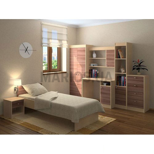 Детская спальня Тинэйджер - является совокупностью таких модульных единиц, которые сделают комнату Вашего подростка практичной. Все модули удачно выполняют свои функции. Место найдется для отдыха и сна, для одежды, для любимых книг или игр. За столом будет удобно делать уроки. Прикроватная тумба послужит для хранения мелочей и местом для установки светильника. Спальня выполнена в неярких, более взрослых, тонах, что позитивно будет влиять на эмоциональность и душевное равновесие. В состав спальниТинэйджер входят: кровать;прикроватная тумба;двухстворчатый шкаф;письменный стол;полка;стеллаж с открытыми полочками и шкафчиком;комод, который состоит из 4-х выдвижных ящиков.