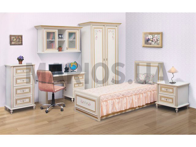 Характеристики мебели Материал ДСП, МДФ Детский гарнитур для спальни Сорренто В комплект входит: Кровать односпальная Сорренто 90х200Тумба прикроватная СоррентоКомод Сорренто 0,6Шкаф Сорренто 2ДПисьменный стол СоррентоНавесная тумба Сорренто Цена кровати указана без стоимости матраса и каркасного основания. Возможно изготовление в таких цветовых вариантах: Фасад - МДФ прованс светлый Корпус - ДСП прованс светлый Сорренто - обработка классического дизайна со стилизацией "под старину" с оригинальными деталями и фурнитурой. Художественная обработка фасадов.