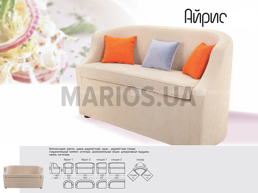 Диван "Айрис" имеет универсальный внешний вид, который выгодно оттеняют круглая спинка и изогнутые подлокотники. Таким образом, модель легко вписывается в рамки любого помещения. Комплектация: кресло, диван двухместный, диван трехместный, одно-, двухместная секция, соединительный элемент "сектор". Рекомендуемые обивочные материалы: Кожзамы мягкие, эластичные. Кожи тонкие. Ткани однотонные. Запрет на применение: кожи ПУ, крокко, буттеро, бикла. Ткани сыпучие, с раппортом (узором), в полоску. Примечание: возможна комбинация цветов обивочных материалов на каркасе и сиденье. Возможно выполнять декоративный кант в материалах контрастного цвета одной серии или артикула.