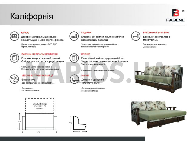 107.00см x 217.00см x 112.00см Вес0.00кг Характеристики дивана (кресла, тахты, углового дивана) Механизм трансформацииеврокнижкаОснова сидениявысококачественный пенополиуретан Vita, Польша, войлок, пружинный блок.Размер спального места160х195Бельевой ящикесть Диван California Диван-кровать в ретро стиле с шикарными деревянными подлокотниками из ольхи и ящиком для белья. Механизм трансформации - шаговый или еврокнижка. Обивка любой тканью на выбор из каталога. Характеристики: Длина: 217 см Глубина: 107 см Высота сидения: 50 см Высота спинки: 112 см Длина спального места: 195 см Ширина спального места: 160 см Основание спального места: ДСП, пружинный блок. Механизм трансформации спального места: еврокнижка. Каркас: натуральное дерево, ДСП, ДВП. Опоры: дерево. Подушка сидения и спинки: высококачественный пенополиуретан Vita, Польша, войлок, пружинный блок.