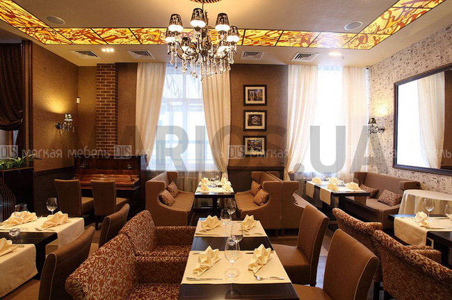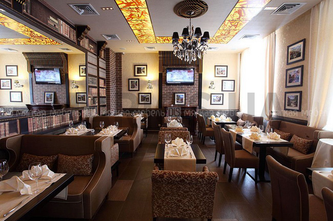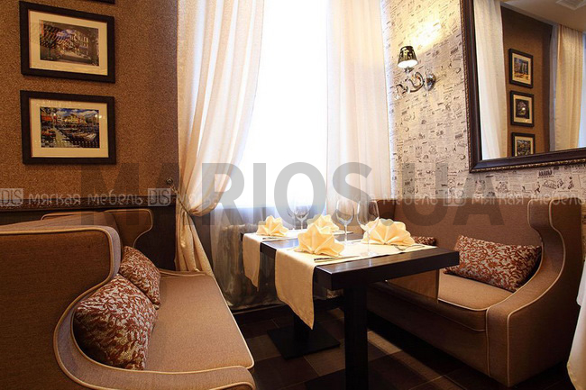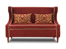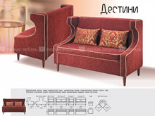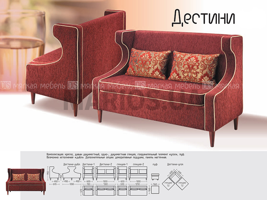 Диван "Дестини" привлекает свое внимание строгим, но привлекательным дизайном - подлокотники выполнены в форме полукругов, по краям изделия - контрастные швы, картину же дополняют подушки с орнаментом. Изделие прекрасно подойдет для ресторана с европейским направлением, с восточным, также впишется в рамки концертных заллов, холла гостиницы. Комплектация: кресло, диван двухместный, одно-, двухместная секция, соединительный элемент "угол", пуф, подушка. Возможно исполнение "дабл". Дополнительные опции: декоративные подушки, панель настенная. Рекомендуемые обивочные материалы: кожзамы мягкие, эластичные. Кожи тонкие. Ткани однотонные. Запрет на применение: кожи ПУ, крокко, буттеро, бикла, черато, лагуна. Ткани сыпучие, с раппортом (узором), в полоску. Примечание: рекомендуется применять ткани-компаньоны. Декоративный кант выполнять в материалах контрастного цвета. Декоративные подушки выполнять в тканях с раппортом и в полоску.