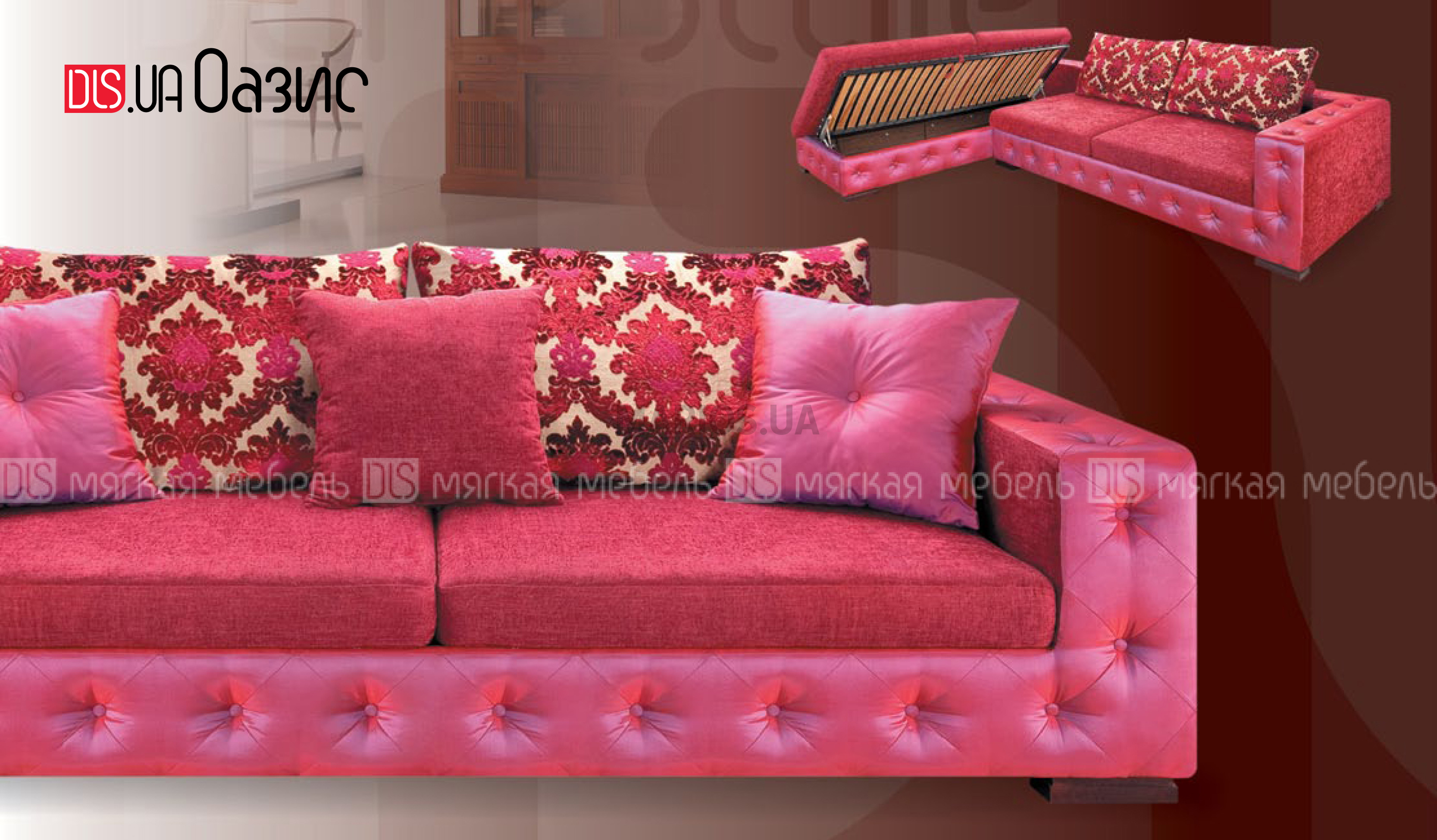 Диван "Оазис" - настоящая дань моде. Комбинация тканевых фактур, втяжки, оформленные складками и пуговицами делают модель особенной, такой, которая не останется незамеченной. Она успешно комбинирует современные тенденции с нотками барокко. Комплектация: кресло, диван двухместный, диван трехместный, секции одно-, двух-, трехместные, шезлонг, пуф. Особенности: основание сидений - рама с ламелями. Каркас оформлен пуговицами. Опоры выполнены из натуральной древесины. Дополнительные опции: механизм трансформации "Мералат", место для хранения, декоративные подушки. Рекомендуемые обивочные материалы: Каркас: кожзамы мягкие, эластичные. Кожи тонкие. Ткани однотонные на трикотажной основе. Подушки: все ткани. Запрет на применение: кожи ПУ, крокко, буттеро, бикла, черато, лагуна. На каркас: ткани сыпучие, ворсистые (велюры), ткани с раппортом (узором), в полоску. Раскладной механизм + 3980 грн.