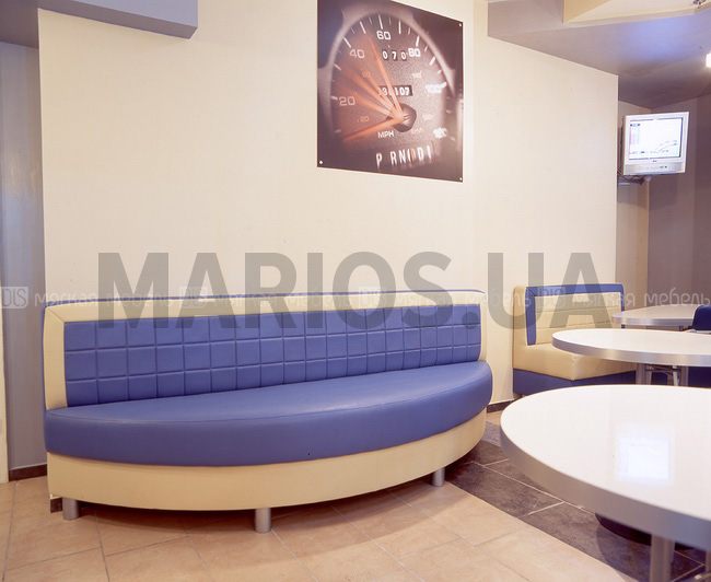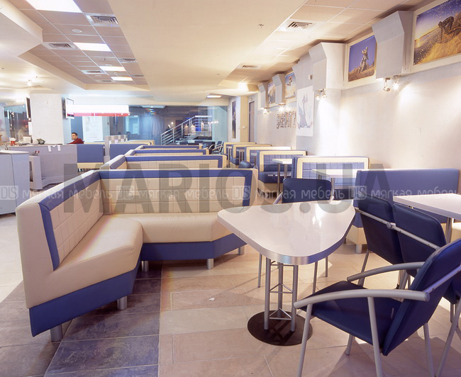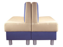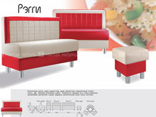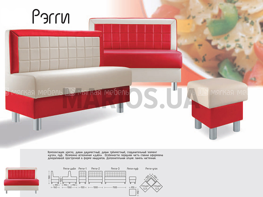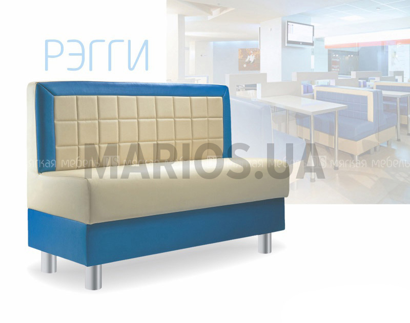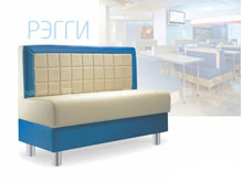 Благодаря своему внешнему виду, диван "Регги" - это то, в чем нуждается кафе или ресторан. Мягкие формы, игра контрастов и цилиндрические ножки, выполненные в металле, добавляют уют помещению и аппетит клиентам. Комплектация: кресло, диван двухместный, диван трехместный, соединительный элемент "угол", пуф. Возможно исполнение "дабл". Особенности: передняя часть спинки оформлена декоративной прострочкой в форме квадратов. Дополнительные опции: панель настенная. Рекомендуемые обивочные материалы: кожзамы мягкие, эластичные. Кожи тонкие. Ткани однотонные. Запрет на применение: кожи ПУ, крокко, буттеро, бикла. Ткани сыпучие, ворсистые (велюры), "рогожка", с раппортом (узором), в полоску. Примечание: при комбинации цветов обивочный материал должен быть одной серии (артикула), кожи одинаковой плотности.