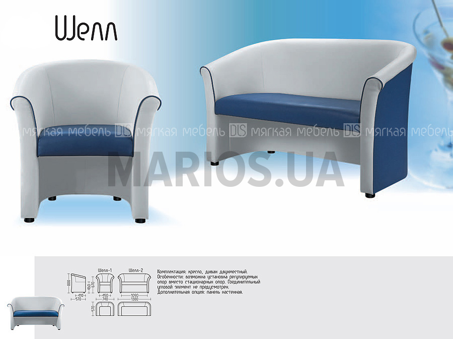 Диван "Шелл" успешно комбинирует игру на контрастах в рамках форм и цветов. Как следствие, модель обращает на себя внимание, при этом легко вливаясь в интерьер помещений ресторанно-отельной индустрии. Комплектация: кресло, диван двухместный. Особенности: возможна установка регулируемых опор вместо стационарных опор. Дополнительные опции: панель настенная. Рекомендуемые обивочные материалы: кожзамы мягкие, эластичные. Кожи тонкие. Ткани однотонные на трикотажной основе. Запрет на применение: кожи ПУ, крокко, буттеро, бикла, черато, лагуна. Ткани сыпучие, ворсистые (велюры), шениллы, "рогожка", с раппортом (узором), в полоску. Примечание: при комбинировании цветов обивочный материал должен быть одной серии (артикула), кожи одинаковой плотности.