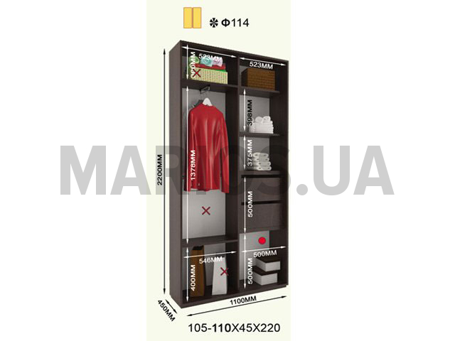 45.00см x 110.00см x 220.00см Характеристики шкафа Количество дверей2 двери Материал корпусаДСП 18мм, кромка ПВХ 0,5 и 2мм Оснащение6 полок, две двери (ДСП или зеркало), 1 отделения для тремпелей Форма шкафалинейный Двухдверный шкаф Фаворит Ф114 220В комплектацию модели входит: 6 полок, одно отделения для тремпелей и две двери с профилем Элит в цвете серебро. Двери шкафа могут быть выполнены из ДСП, зеркальные, комбинированные или же с вертикальными делениями. Дополнительно можно заказать бельевой отдел, радиус Ф 45, радиус Ф 60, полку, трубу, стойку. За дополнительную плату. Размеры шкафа: глубина/ширина/высота - 45/101-109/220.Цена указана за шкаф стандартного размера шириной 220см. Материалы, из которых изготовлен шкаф: Корпус: ДСП 18мм; Фасады: зеркальные или ДСП; Кромка: ПВХ 0.5 и 2мм; Зеркало: 4 мм; Штанга: микролифт металлический. Профиль: Элит или Квадратный. Цвет: серебро, золото светлое, бронза светлая, венге глянец. Раздвижная система: алюминиевая.