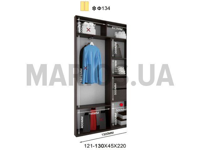 45.00см x 130.00см x 220.00см Характеристики шкафа Количество дверей2 двери Материал корпусаДСП 18мм, кромка ПВХ 0,5 и 2мм Оснащение6 полок, две двери (ДСП или зеркало), 1 отделения для тремпелей Форма шкафалинейный Двухдверный шкаф Фаворит Ф134 220В комплектацию модели входит: 6 полок, одно отделения для тремпелей и две двери с профилем Элит в цвете серебро. Двери шкафа могут быть выполнены из ДСП, зеркальные, комбинированные или же с вертикальными делениями. Дополнительно можно заказать бельевой отдел, радиус Ф 45, радиус Ф 60, полку, трубу, стойку. За дополнительную плату. Размеры шкафа: глубина/ширина/высота - 45/121-130/220. Цена указана за шкаф стандартного размера шириной 130 см и высотой 220см. Шкаф с нестандартной шириной от 121 до 129 оплачивается дополнительно. Также возможно изготовление шкафа высотой 250 см.Материалы, из которых изготовлен шкаф: Корпус: ДСП 18мм; Фасады: зеркальные или ДСП; Кромка: ПВХ 0.5 и 2мм; Зеркало: 4 мм; Штанга: микролифт металлический. Профиль: Элит или Квадратный. Цвет: серебро, золото светлое, бронза светлая, венге глянец. Раздвижная система: алюминиевая.