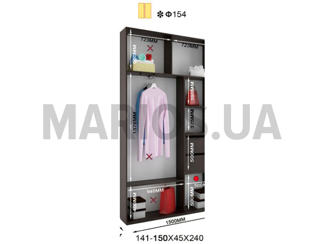 45.00см x 150.00см x 240.00см Характеристики шкафа Количество дверей2 двери Материал корпусаДСП 18мм, кромка ПВХ 0,5 и 2мм Оснащение6 полок, две двери (ДСП или зеркало), 1 отделения для тремпелей Форма шкафалинейный Двухдверный шкаф Фаворит Ф154 240В комплектацию модели входит: 6 полок, одно отделения для тремпелей и две двери с профилем Элит в цвете серебро. Двери шкафа могут быть выполнены из ДСП, зеркальные, комбинированные или же с вертикальными делениями. Дополнительно можно заказать бельевой отдел, радиус Ф 45, радиус Ф 60, радиус Ф 35, радиус Ф 50, полку, трубу, стойку. За дополнительную плату. Размеры шкафа: глубина/ширина/высота - 45/141-150/240. Цена указана за шкаф стандартного размера шириной 140 см и высотой 240см. Шкаф с нестандартной шириной от 141 до 149 оплачивается дополнительно. Также возможно изготовление шкафа высотой 250 смМатериалы, из которых изготовлен шкаф: Корпус: ДСП 18мм; Фасады: зеркальные или ДСП; Кромка: ПВХ 0.5 и 2мм; Зеркало: 4 мм; Штанга: микролифт металлический. Профиль: Элит или Квадратный. Цвет: серебро, золото светлое, бронза светлая, венге глянец. Раздвижная система: алюминиевая.