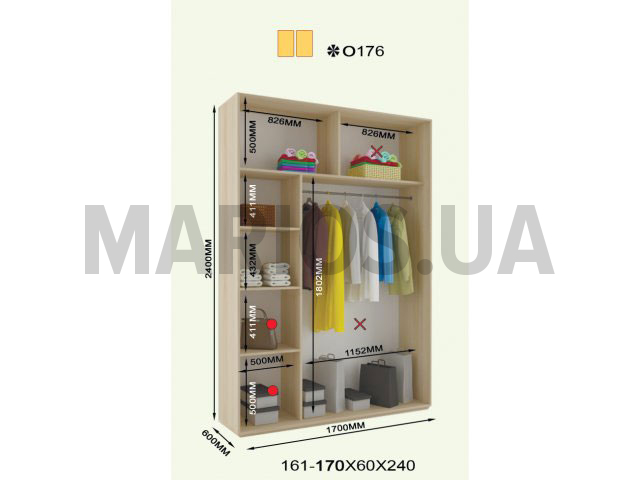 60.00см x 170.00см x 240.00см Вес0.00кг Характеристики шкафа Количество дверей2 двериМатериал корпусаДСП 16мм, кромка ПВХ 0,5 и 2ммОснащение6 полок, штанга для тремпелей, две двери (зеркало с пескоструем)Форма шкафалинейный Двухдверный шкаф-купе О-176 240 с пескоструем. В комплектацию шкафа входит: 6 полок, отделение для тремпелей и две двери с профилем Элит в цвете серебро. Дополнительно можно заказать блок В35 и В50.Размеры шкафа: глубина/ширина/высота - 60/161-170/240.Цена указана за шкаф стандартного размера шириной 170см. Шкаф с нестандартной шириной от 161см до 169см оплачивается дополнительно. Также возможно изготовление шкафа высотой 250см.Материалы, из которых изготовлен шкаф-купе О-176 240 с пескоструем: Корпус: ДСП 16мм; Фасады: зеркальные с пескоструем; Кромка: ПВХ 0.5 и 2мм; Зеркало: 4 мм; Штанга: микролифт металлический. Раздвижная система: алюминиевая.