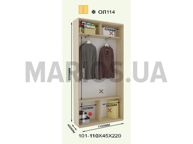 110.00см x 45.00см x 220.00см Характеристики шкафа Количество дверей2 двери Материал корпусаДСП 16мм, кромка ПВХ 0,5 и 2мм Оснащение5 полок, две штанги для тремплей, две двери (ДСП, зеркало) Форма шкафалинейный Двухдверный шкаф-купе ОЛ-114 220. Состоит из шести полок и двух штанг для тремпелей. Двери шкафа могут быть выполнены из ДСП, зеркальные, комбинированные или же с вертикальными делениями. Размеры шкафа: глубина/ширина/высота - 45/101-110/220.Цена указана за шкаф стандартного размера шириной 110см. Шкаф с нестандартной шириной от 101см до 109 см оплачивается дополнительно. Также возможно изготовление шкафа высотой 250 см.Материалы, из которых изготовлен шкаф-купе ОЛ-114 220: Корпус: ДСП 16мм; Фасады: зеркальные и панельные; Кромка: ПВХ 0.5 и 2мм; Зеркало: 4 мм; Штанга: микролифт металлический. Профиль: Элит или Квадратный. Цвет: серебро, золото светлое, бронза светлая, венге глянец. Раздвижная система: алюминиевая.