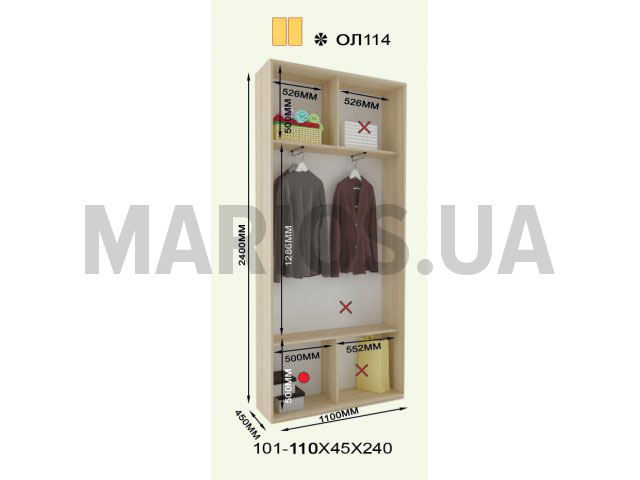 110.00см x 45.00см x 240.00см Характеристики шкафа Количество дверей2 двери Материал корпусаДСП 16мм, кромка ПВХ 0,5 и 2мм Оснащение4 полки, две штанги для тремплей, две двери (ДСП или зеркало) Форма шкафалинейный Двухдверный шкаф-купе ОЛ 114 240. Состоит из четырех полок и двух штанг для тремпелей. Двери шкафа могут быть выполнены из ДСП, зеркальные, комбинированные или же с вертикальными делениями. Размеры шкафа: глубина/ширина/высота - 45/101-110/240. Цена указана за шкаф стандартного размера шириной 110см. Шкаф с нестандартной шириной от 101см до 109 см оплачивается дополнительно. Также возможно изготовление шкафа высотой 250 см.Материалы, из которых изготовлен шкаф-купе ОЛ-114 240: Корпус: ДСП 16мм; Фасады: зеркальные и панельные; Кромка: ПВХ 0.5 и 2мм; Зеркало: 4 мм; Штанга: микролифт металлический. Профиль: Элит или Квадратный. Цвет: серебро, золото светлое, бронза светлая, венге глянец. Раздвижная система: алюминиевая.