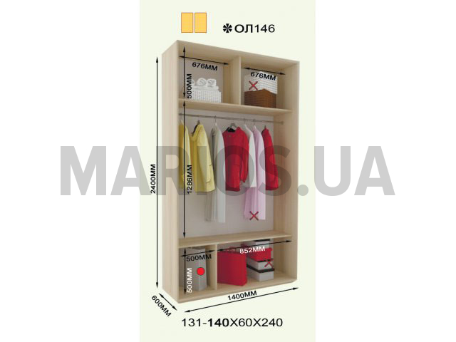 140.00см x 60.00см x 240.00см Характеристики шкафа Количество дверей2 двери Материал корпусаДСП 16мм, кромка ПВХ 0,5 и 2мм Оснащение4 полки, штанга для тремпелей, две двери (ДСП или зеркало) Форма шкафалинейный Двухдверный шкаф-купе ОЛ 146 240.В комплектацию шкафа входит: 4 полки, отделение для тремпелей и две двери с профилем Элит в цвете серебро. Двери шкафа могут быть выполнены из ДСП, зеркальные, комбинированные или же с вертикальными делениями. Размеры шкафа: глубина/ширина/высота - 60/131-140/240.Цена указана за шкаф стандартного размера шириной 140см. Шкаф с нестандартной шириной от 131см до 139см оплачивается дополнительно. Также возможно изготовление шкафа высотой 250см.Материалы, из которых изготовлен шкаф-купе ОЛ 146 240: Корпус: ДСП 16мм; Фасады: зеркальные и панельные; Кромка: ПВХ 0.5 и 2мм; Зеркало: 4 мм; Штанга: микролифт металлический. Профиль: Элит или Квадратный. Цвет: серебро, золото светлое, бронза светлая, венге глянец. Раздвижная система: алюминиевая.
