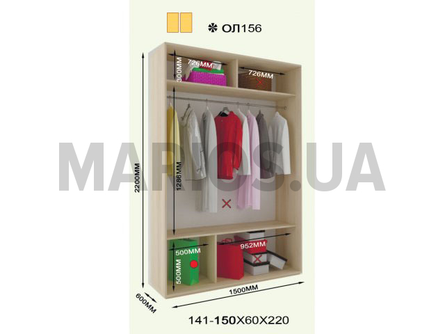150.00см x 60.00см x 220.00см Характеристики шкафа Количество дверей2 двери Материал корпусаДСП 16мм, кромка ПВХ 0,5 и 2мм Оснащение4 полок, штанга для тремпелей, две двери (ДСП или зеркало) Форма шкафалинейный Двухдверный шкаф-купе ОЛ 156 220.В комплектацию шкафа входит: 4 полок, отделение для тремпелей и две двери с профилем Элит в цвете серебро. Двери шкафа могут быть выполнены из ДСП, зеркальные, комбинированные или же с вертикальными делениями. Размеры шкафа: глубина/ширина/высота - 60/141-150/240.Цена указана за шкаф стандартного размера шириной 150см. Шкаф с нестандартной шириной от 141см до 149см оплачивается дополнительно. Также возможно изготовление шкафа высотой 250см.Материалы, из которых изготовлен шкаф-купе ОЛ 156 220: Корпус: ДСП 16мм; Фасады: зеркальные и панельные; Кромка: ПВХ 0.5 и 2мм; Зеркало: 4 мм; Штанга: микролифт металлический. Профиль: Элит или Квадратный. Цвет: серебро, золото светлое, бронза светлая, венге глянец. Раздвижная система: алюминиевая.