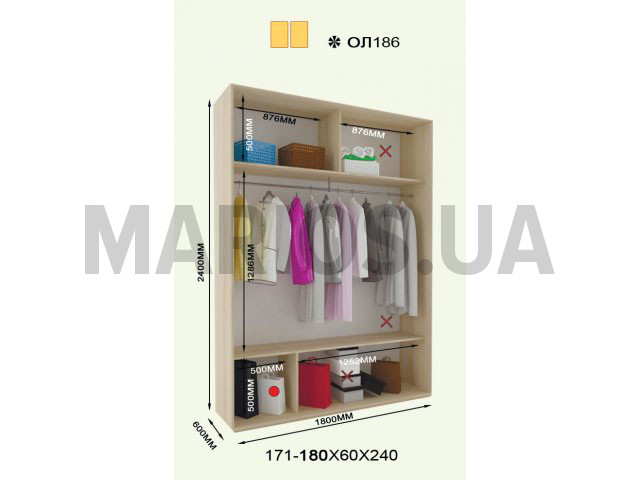 180.00см x 60.00см x 240.00см Характеристики шкафа Количество дверей2 двери Материал корпусаДСП 16мм, кромка ПВХ 0,5 и 2мм Оснащение4 полки, штанга для тремпелей, две двери (ДСП или зеркало) Форма шкафалинейный Двухдверный шкаф-купе ОЛ 186 240.В комплектацию шкафа входит: 4 полки, отделение для тремпелей и две двери с профилем Элит в цвете серебро. Двери шкафа могут быть выполнены из ДСП, зеркальные, комбинированные или же с вертикальными делениями. Размеры шкафа: глубина/ширина/высота - 60/171-180/240.Цена указана за шкаф стандартного размера шириной 180см. Шкаф с нестандартной шириной от 171см до 179см оплачивается дополнительно. Также возможно изготовление шкафа высотой 250см.Материалы, из которых изготовлен шкаф-купе ОЛ 186 240: Корпус: ДСП 16мм; Фасады: зеркальные и панельные; Кромка: ПВХ 0.5 и 2мм; Зеркало: 4 мм; Штанга: микролифт металлический. Профиль: Элит или Квадратный. Цвет: серебро, золото светлое, бронза светлая, венге глянец. Раздвижная система: алюминиевая.
