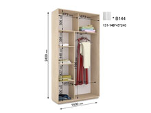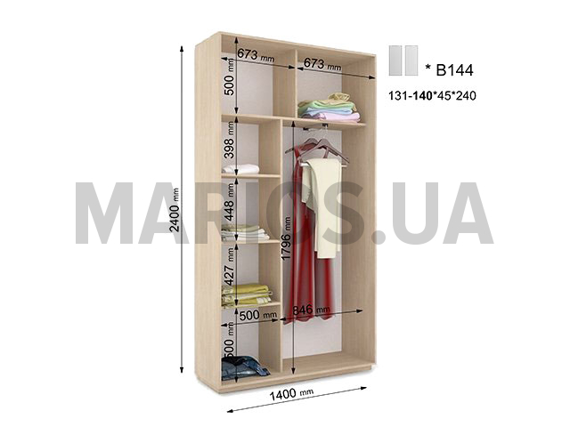 45.00см x 140.00см x 240.00см Характеристики шкафа Количество дверей2 двери Материал корпусаДСП 18мм, кромка ПВХ 0,5 и 2мм Оснащение6 полок, две двери (ДСП или зеркало), микролифт Форма шкафалинейный <strong style="font-size: 12px;">Двухдверный шкаф-купе В144 - это отличная модель современности, которая компактно разместиться в любом помещении и украсит Ваш интерьер. В комплектацию шкафа входит: 6 полок, отделение для тремпелей с микролифтом и две двери с профилем Элит в цвете серебро. Дополнительно можно заказать блок В35. Двери шкафа могут быть выполнены из ДСП, зеркальные, комбинированные или же с горизонтальными делениями. Размеры шкафа: глубина/ширина/высота - 45/131-140/240. Цена указана за шкаф стандартного размера шириной 140см. Шкаф с нестандартной шириной от 131см до 139см оплачивается дополнительно. Также возможно изготовление шкафа высотой 250см. Материалы, из которых изготовлен шкаф-купе В144: Корпус: ДСП 18мм; Фасады: зеркальные и панельные; Кромка: ПВХ 0.5 и 2мм; Зеркало: 4 мм; Штанга: микролифт металлический. Профиль: Элит или Квадратный. Цвет: серебро, золото светлое, бронза светлая, венге глянец. Раздвижная система: алюминиевая. Стандартные цвета в складской программе: венге магия; яблоня Локарно; ольха горная; дуб молочный; белый; орех лесной. Срок изготовления шкафов в стандартной цветовой гамме составляет 3-4 дня. Стандартные цвета, не входящие в складскую программу: орех темный. Срок изготовления шкафов в этих цветах составляет 10 дней. Нестандартные цвета: дуб арканзас темный. Шкафы в нестандартных цветах изготавливаются за дополнительную плату в течении 10 дней. Данные цвета не используются для фасадов.