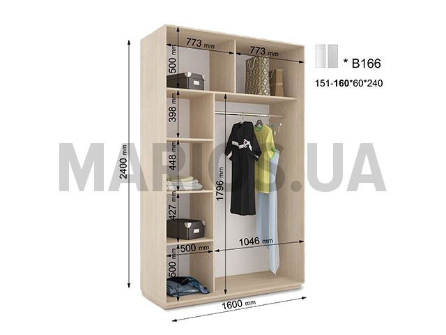 60.00см x 160.00см x 240.00см Вес0.00кг Характеристики шкафа Количество дверей2 двериМатериал корпусаДСП 18мм, кромка ПВХ 0,5 и 2ммОснащение6 полок, две двери (ДСП или зеркало)Форма шкафалинейный Двухдверный шкаф-купе В166 - это качество, компактность и современный стиль. Размещая такую модель в помещении, Вы не только украсите интерьер, но и вместите в ней немало полезных вещей. В комплектацию шкафа входит: 6 полок, отделение для тремпелей и две двери с профилем Элит в цвете серебро. Дополнительно можно заказать блок В35 и В50. Двери шкафа могут быть выполнены из ДСП, зеркальные, комбинированные или же с горизонтальными делениями. Размеры шкафа: глубина/ширина/высота - 60/151-160/240. Цена указана за шкаф стандартного размера шириной 160см. Шкаф с нестандартной шириной от 151см до 159см оплачивается дополнительно. Также возможно изготовление шкафа высотой 250см. Материалы, из которых изготовлен шкаф-купе В166: Корпус: ДСП 18мм; Фасады: зеркальные и панельные; Кромка: ПВХ 0.5 и 2мм; Зеркало: 4 мм; Штанга: микролифт металлический. Профиль: Элит или Квадратный. Цвет: серебро, золото светлое, бронза светлая, венге глянец. Раздвижная система: алюминиевая.Стандартные цвета в складской программе:венге магия; яблоня Локарно; ольха горная; дуб молочный; белый; орех лесной.Срок изготовления шкафов в стандартной цветовой гамме составляет 3-4 дня.Стандартные цвета, не входящие в складскую программу:орех темный.Срок изготовления шкафов в этих цветах составляет 10 дней.Нестандартные цвета:дуб арканзас темный.Шкафы в нестандартных цветах изготавливаются за дополнительную плату в течении 10 дней. Данные цвета не используются для фасадов.