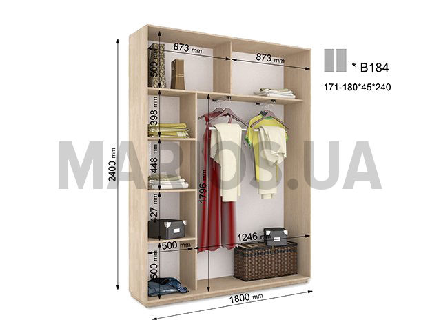 45.00см x 180.00см x 240.00см Характеристики шкафа Количество дверей2 двери Материал корпусаДСП 18мм, кромка ПВХ 0,5 и 2мм Оснащение6 полок, две двери (ДСП или зеркало), микролифт Форма шкафалинейный Данная модель со стандартной шириной, с зеркальными дверями, профилем серебро в цветах: венге, дуб сонома, орех лесной, дуб молочный, белый поддерживаются на складе.<strong style="font-size: 12px;">Двухдверный шкаф-купе В184 - это исключительно практичный и стильный шкаф, который вместит в себя массу нужных вещей и, плюс к этому, украсит Ваш интерьер.В комплектацию модели входит: 6 полок, отделение для тремпелей с двумя микролифтами и две двери с профилем Элит в цвете серебро. Дополнительно можно заказать блок В35. Двери шкафа могут быть выполнены из ДСП, зеркальные, комбинированные или же с вертикальными делениями. Размеры шкафа: глубина/ширина/высота - 45/171-180/240. Цена указана за шкаф стандартного размера шириной 180см. Шкаф с нестандартной шириной от 171см до 179см оплачивается дополнительно. Также возможно изготовление шкафа высотой 250см. Материалы, из которых изготовлен шкаф-купе В184: Корпус: ДСП 18мм; Фасады: зеркальные и панельные; Кромка: ПВХ 0.5 и 2мм; Зеркало: 4 мм; Штанга: микролифт металлический. Профиль: Элит или Квадратный. Цвет: серебро, золото светлое, бронза светлая, венге глянец. Раздвижная система: алюминиевая. Стандартные цвета в складской программе: венге магия; яблоня Локарно; ольха горная; дуб молочный; белый; орех лесной. Срок изготовления шкафов в стандартной цветовой гамме составляет 3-4 дня. Стандартные цвета, не входящие в складскую программу: орех темный. Срок изготовления шкафов в этих цветах составляет 10 дней. Нестандартные цвета: дуб арканзас темный. Шкафы в нестандартных цветах изготавливаются за дополнительную плату в течении 10 дней. Данные цвета не используются для фасадов.