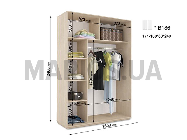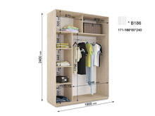 60.00см x 180.00см x 240.00см Вес0.00кг Характеристики шкафа Количество дверей2 двериМатериал корпусаДСП 18мм, кромка ПВХ 0,5 и 2ммОснащение6 полок, две двери (ДСП или зеркало)Форма шкафалинейный Данная модель со стандартной шириной, с зеркальными дверями, профилем серебро в цветах: венге, дуб сонома, орех лесной, дуб молочный, белый поддерживаются на складе. Двухдверный шкаф-купе В186 - это очень нужная вещь в доме. Шкаф современный, стильный, поэтому Вы не только украсите интерьер, но и вместите в ней немало полезных вещей. В комплектацию шкафа входит: 6 полок, отделение для тремпелей и две двери с профилем Элит в цвете серебро. Дополнительно можно заказать блок В35 и В50. Двери шкафа могут быть выполнены из ДСП, зеркальные, комбинированные. Размеры шкафа: глубина/ширина/высота - 60/171-180/240. Возможно выполнение шкафов высотой 250см за дополнительную плату. Материалы, из которых изготовлен шкаф-купе В186: Корпус: ДСП 18мм; Фасады: зеркальные и панельные; Кромка: ПВХ 0.5 и 2мм; Зеркало: 4 мм; Штанга: микролифт металлический. Профиль: Элит или Квадратный. Цвет: серебро, золото светлое, бронза светлая, венге глянец. Раздвижная система: алюминиевая.Стандартные цвета в складской программе:венге магия; яблоня Локарно; ольха горная; дуб молочный; белый; орех лесной.Срок изготовления шкафов в стандартной цветовой гамме составляет 3-4 дня.Стандартные цвета, не входящие в складскую программу:орех темный.Срок изготовления шкафов в этих цветах составляет 10 дней.Нестандартные цвета:дуб арканзас темный.Шкафы в нестандартных цветах изготавливаются за дополнительную плату в течении 10 дней. Данные цвета не используются для фасадов.