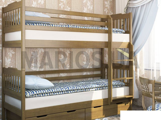 198.00см x 88.00см x 170.00см Вес0.00кг Характеристики мебели Материалмассив натурального дерева Двухъярусная кровать Ева 80х190 – классическая модель, чудесным образом сочетающая элегантность с высочайшей функциональностью. Материалом изготовления является массив натурального дерева ольхи - идеальное сочетание экологической чистоты и эстетического совершенства. За дополнительную плату это может быть массив ясеня или дуба. Покрытие составляет безопасный и гипоаллергенный лак на водной основе. Наличие двух вместительных ящиков позволит компактно разместить не только постельные принадлежности, но и детские игрушки. Лесенка, ведущая на верхний ярус оборудована широкими ступенями для максимальной устойчивости детских ножек. Модель может трансформироваться в две отдельные кровати.Вашему вниманию представлен следующий выбор цветов:орех; светлый орех; темный орех; яблоня; груша; ольха; бук; венге.За дополнительную плату возможно изготовление кровати нестандартного размера, а также предоставляется возможность выбрать нестандартный цвет из коллекции палитры RAL. Изделие покрыто безопасным гипоаллергенным лаком. Сочетая кровать с <a href="https://www.mebelok.com/matrasi-ortop/filter-14-82/15-97/ качественным ортопедическим матрасом, сон Ваших детей будет крепким и здоровым.Размеры спального места кровати Ева Длина, см Ширина, см190 80 Габариты кровати: 88х198см. Высота: 170см.