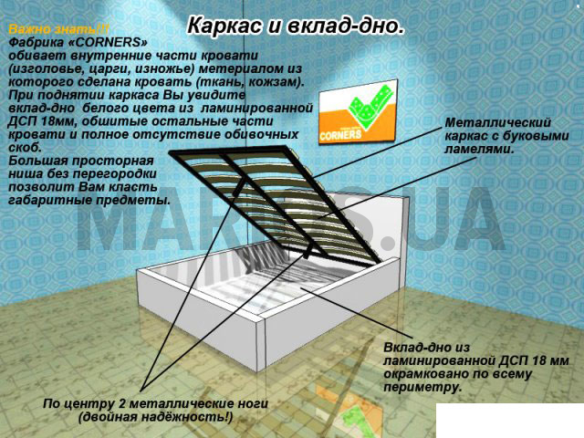 217.00см x 214.00см x 95.00см Вес0.00кг Характеристики каркаса Материал корпусаДСП Кровать Лоренс 200х200 - это превосходная двуспальная модель, которая имеет грациозный и стильный дизайн, дарящий уютную и гармоничную атмосферу. Ваша спальня будет наполнена положительной энергетикой, поэтому настроение после отдыха всегда будет на высоте.<em><u>Немного подробностей о кровати:</u></em> - имеется подъемный механизм, который включен в стоимость изделия; - модель укомплектована ламелями, толщиной 8 мм, ширина между которыми стандарт - 6,5 мм и это уже входит в цену, а за дополнительную плату Вы можете заказать кровать с расстоянием между ними: XL - 4,5 или XXL - 2,5 мм (стоимость читайте выше); - под ортопедическим матрасом расположен вместительный короб для постельных принадлежностей или любых других вещей, которые не нашли свое место в шкафу; - высота изголовья - 960 мм, высота изножья - 330 мм - на Ваш вкус можно подобрать любой оттенок, который подойдет к Вашему интерьеру;Кровать Лоренс создана для тех, кто ценит комфортный отдых и стильный интерьер. <em>Производитель Corners дает гарантию на кровать Лоренс - 3 года.</em>Состав:ДСП; пенополиуретан; флизелин; эко-кожа или ткань.<o:p></o:p>Размеры матраса для кровати Лоренс Длина, см Ширина, см217 214Кровать можно укомплектовать качественным <a href="https://www.mebelok.com/matrasi-ortop/filter-14-93/15-98/ ортопедическим матрасом и тогда Ваша жизнь станет еще лучше!В обивке кровати Лоренс могут применяться ткани из каталога Обивочные ткани