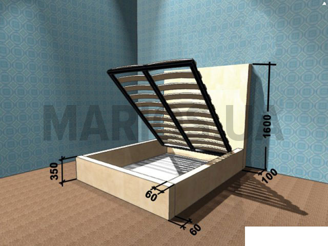 Спальное место состоит из металлического каркаса с гнутыми буковыми ламелями толщиной 8мм, расстояние между которыми стандартно составляет 6,5 мм. За дополнительную плату данную модель можно заказать с ламелями, промежуток между которыми составляет XL – 4,5 мм или XXL – 2,5 мм.