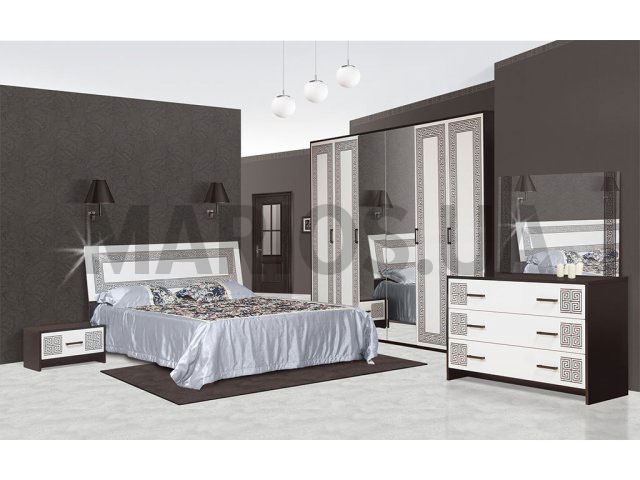 Характеристики мебели Материал ДСП ламинированное 18 мм Спальный гарнитур Бася новая (Олимпия) 6Д В комплект входит: Комод Бася новая (Олимпия)Тумба прикроватная Бася новая (Олимпия)Зеркало Бася новая (Олимпия)Кровать двуспальная 160х200 Бася новая (Олимпия)Шкаф Бася новая (Олимпия) 6Д Возможно изготовление в таких цветовых вариантах: Цвет фасада - ДСП белый лак Цвет корпуса - ДСП черный лак Фасад всех эементов спального гарнитура украшен орнаментом в греческом стиле.
