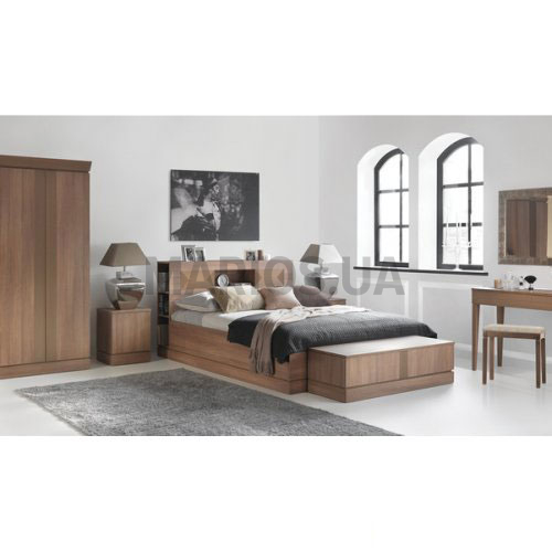 Характеристики мебели Материал ламинированное ДСП Гарнитур для спальни Classik - это не только красивый, модный элемент интерьера, но и практичный, функциональный комплект мебели. В данном гарнитуре учтено все: комфортное место для сна и отдыха, вместительное место для хранения вещей, приятное времяпровождение за вечерним и утренним туалете, комфортное сидение за туалетным столиком. С таким гарнитуром Ваша спальня будет выглядеть по особенному, создаст уют и гармонию. В гарнитур для спальни Classik входит: вместительный двухдверный шкаф с полкой и штангой для висящей одежды. При его открытии автоматически включается свет, что способствует беспрепятственному поиску одежды;роскошная, функциональная двуспальная кровать. Оснащена подъемным механизмом, что обеспечивает легкий доступ к вместительному ящику для хранения постельных принадлежностей или вещей. В изголовье кровати имеется множество полок для хранения подручных средств;две прикроватные тумбы, неотъемлемое дополнение к кровати. Могут служить ночным прикроватным столиком. На них можно поставить лампы, а в тумбы сложить разные вещицы;простой, строгий туалетный столик. Столик имеет высокие ножки, выдвижной ящик для женских мелких вещиц, с рельефным декором в виде конверта, создастэлегантный вид в спальной комнате;мягкий табурет, обеспечит комфортное сидение у туалетного столика;сундук для хранения вещей. Можно также использовать как прикроватную лавку.