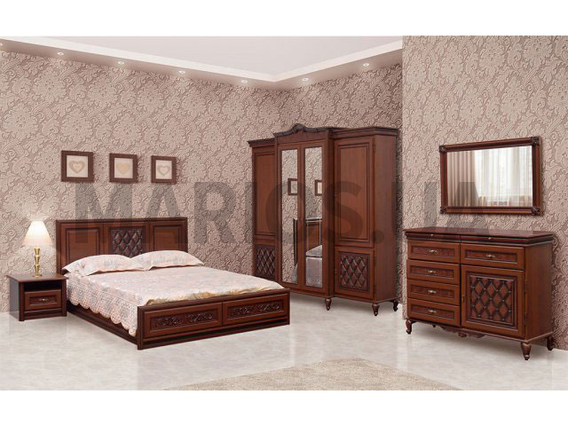 Характеристики мебели Материал Фасад - МДФ, корпус - ДСП ламинированное Гарнитур для спальни Ливорно В комплект входит: Кровать двуспальная Ливорно 160х200Шкаф гардеробный Ливорно 4ДПрикроватная тумба Ливорно - 2 шт.Комод Ливорно 1ДЗеркало Ливорно 1,1 Цена кровати указана без стоимости матраса и каркаса для кровати. Ортопедический матрас нужного размера можно купить здесь. Возможно изготовление в таких цветовых вариантах: Фасад - МДФ прованс светлый, прованс темный Корпус - ДСП прованс светлый, прованс темный Оригинальная модульная система Ливорно. При изготовлении использована качественная фурнитура в цвете латунь. Художественная обработка фасадов.