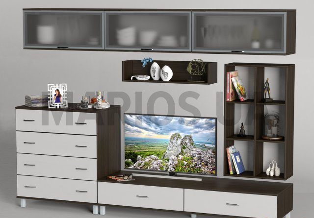 45.00см x 270.00см x 190.00см Характеристики мебели Материалламинированное ДСП Гостиная-19 Вмещает в себя: Тумба под телевизор - 238/2; Пенал - 111/1 (3 шт); Пенал - 120/2. Материалы: кромка меламин, но за дополнительную плату возможна кромка ПВХ. Габаритные размеры: Ширина - 270 см. Глубина -45 см. Высота - 190 см.