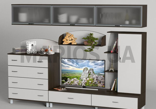 45.00см x 270.00см x 205.00см Характеристики мебели Материалламинированное ДСП Гостиная-23 Вмещает в себя: Тумба под телевизор - 238/2; Пенал - 111/1 (3 шт). Материалы: кромка меламин, но за дополнительную плату возможна кромка ПВХ. Габаритные размеры: Ширина - 270 см. Глубина -45 см. Высота - 205 см.
