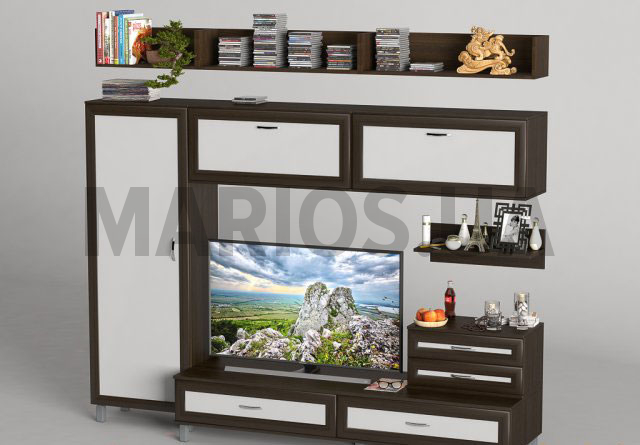 45.00см x 240.00см x 205.00см Характеристики мебели Материалламинированное ДСП Гостиная-26 Вмещает в себя: Тумба под телевизор - 239/2; Пенал - 112/1 (2 шт); Пенал - 120/2 (2 шт); Пенал - 123; Пенал - 124. Материалы: кромка меламин, но за дополнительную плату возможна кромка ПВХ. Габаритные размеры: Ширина - 240 см. Глубина -45 см. Высота - 205 см.