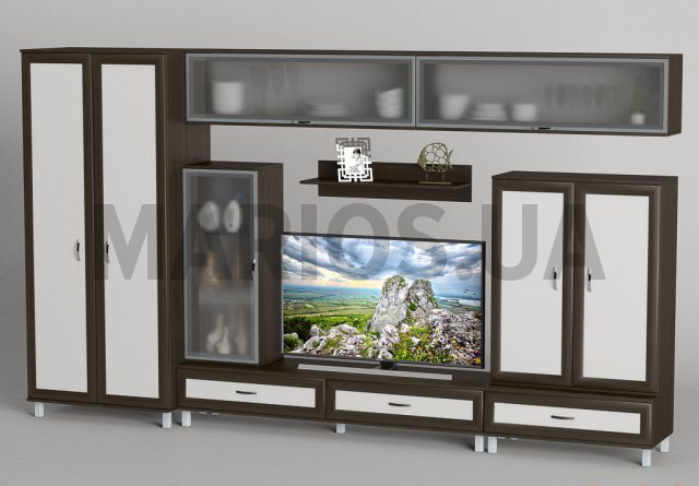 52.00см x 360.00см x 205.00см Характеристики мебели Материал ламинированное ДСП Гостиная-8 Вмещает в себя: Тумба под телевизор - 239/2;Тумба под телевизор - 227/2;Пенал - 115 (2 шт);Пенал - 119/2. Материалы: кромка меламин, но за дополнительную плату возможна кромка ПВХ. Габаритные размеры: Ширина - 360 см.Глубина - 52 см.Высота - 205 см.