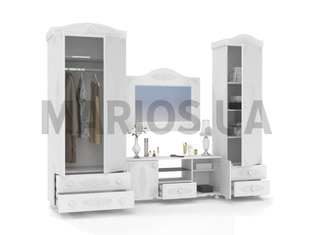 Характеристики мебели Материал ДСП, МДФ Гостиная Ассоль белая. Включает в себя: Пенал с глухим фасадом АС-01; Тумба ТВ АС-13; Зеркало АС-08; Шкаф АС-02. Размеры пенала с глухим фасадом АС-01: ширина - 53 см; длина - 40 см; высота - 206 см. Размеры тумбы ТВ АС-13: ширина - 125 см; глубина - 36 см; высота - 53 см. Размеры зеркала АС-08: ширина - 100 см; глубина - 32 см; высота - 80 см. Размеры шкафа АС-02: ширина - 83 см; глубина - 50 см; высота - 206 см. Ручки – фигурные. Материал фасадов: фирменная текстура 3D. Материал корпуса: ДСП ламинированное 18 мм. Цвет: белый.