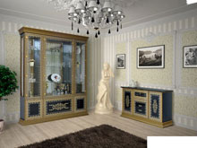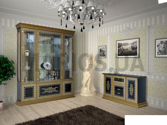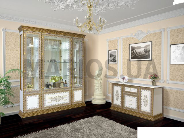 Характеристики мебели Материал ДСП Гостиная Белладжио Гостиная может быть изготовлена в таких цветовых вариантах: цвет корпуса - ДСП белый/ черныйцвет фасадов - ДСП белый/ черный, лак. художественная печать Гостиная продается комплектом. Состав комплекта: Витрина 188х45,5х227Комод 160х46,5х85