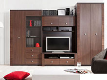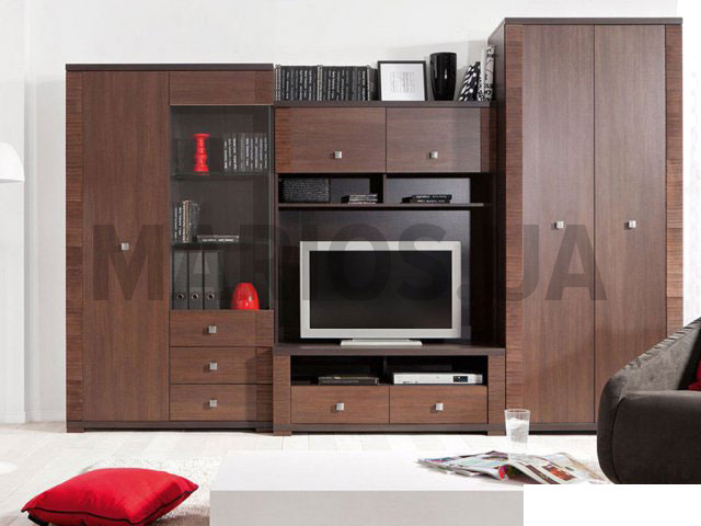 52.50см x 295.00см x 197.50см Характеристики мебели Материал ДСП. Гостиная Яспи Изготавливается в цветах: орех салев; орех салев/белый глянец; венге; венге/белый глянец. Состоит из ТВ тумбы, двух дверного платяного шкафа, надставки с открытыми и закрытыми полками и витрины с тремя выдвижными ящиками. Материал: ДСП. Размеры: (Ш/В/Г) - 295/197.5/52.5 см.