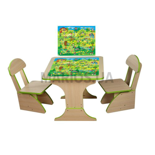 Характеристики мебели Материал ЛДСП Игровой столик растущий + 2 стульчика Игра Характеристики: Размер столика: Высота столика и стульчика регулируется – 5 положений. Высота до столешницы – 60 см (при максимальной сборке) Высота до столешницы – 45 см (при минимальной сборке) Размер столешницы (откидная) – 60х60 см, ящик под столешницей. Подставка для ног. Размер стульчика: Высота стульчика регулируется – 4 положения. Высота до сидения – 40 см (при максимальной сборке). Высота до сидения – 25 см (при минимальной сборке). Размер сидения: 29х29 см Материал набора: ДСП ламинированное. Цвет: молочный дуб с цветной кромкой (салатовый). Рекомендовано для детей: от 3-х до 12 лет.