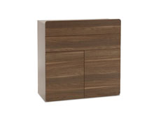 Комод состоит из двух выдвижных ящиков и одного высокого, вместительного шкафчика с двумя полками.