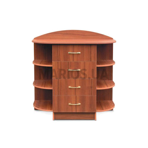 Комод имеет четыре выдвижных ящика, на которых вместо ручек предусмотрены выемки для рук.