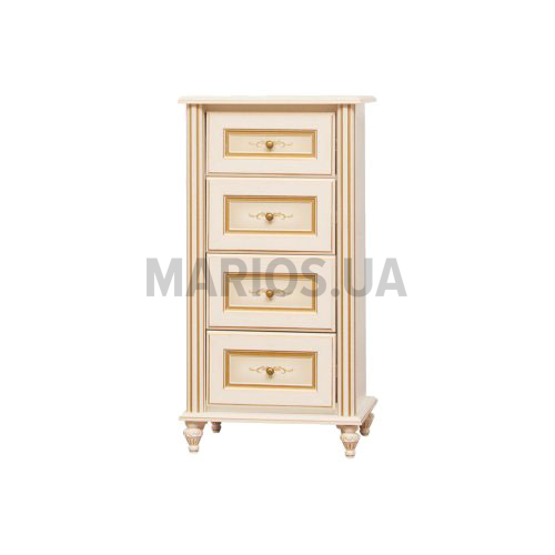 53.00см x 49.00см x 104.00см Характеристики мебели Материал ДСП, МДФ Комод Парма 0,5 Элемент модульной системы Парма. Изготавливается в цвете: Фасад - МДФ прованс белый Корпус - ДСП прованс белый Комод с четырьмя выдвижными ящиками. Парма - мебельная система с художественной обработкой фасадов. Утонченная фурнитура в цвете латунь.